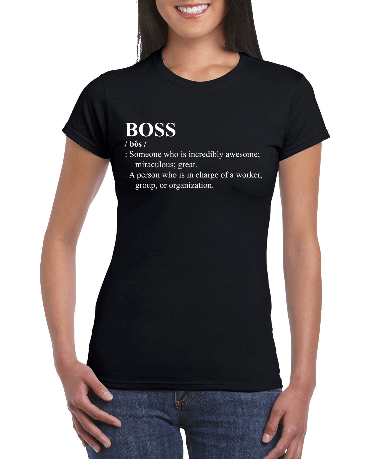 The "BOSS Definition" design is a confident and empowering women's t-shirt. It has a bold "BOSS" typography, and high-quality fabric, and is versatile for various occasions, celebrating female empowerment.