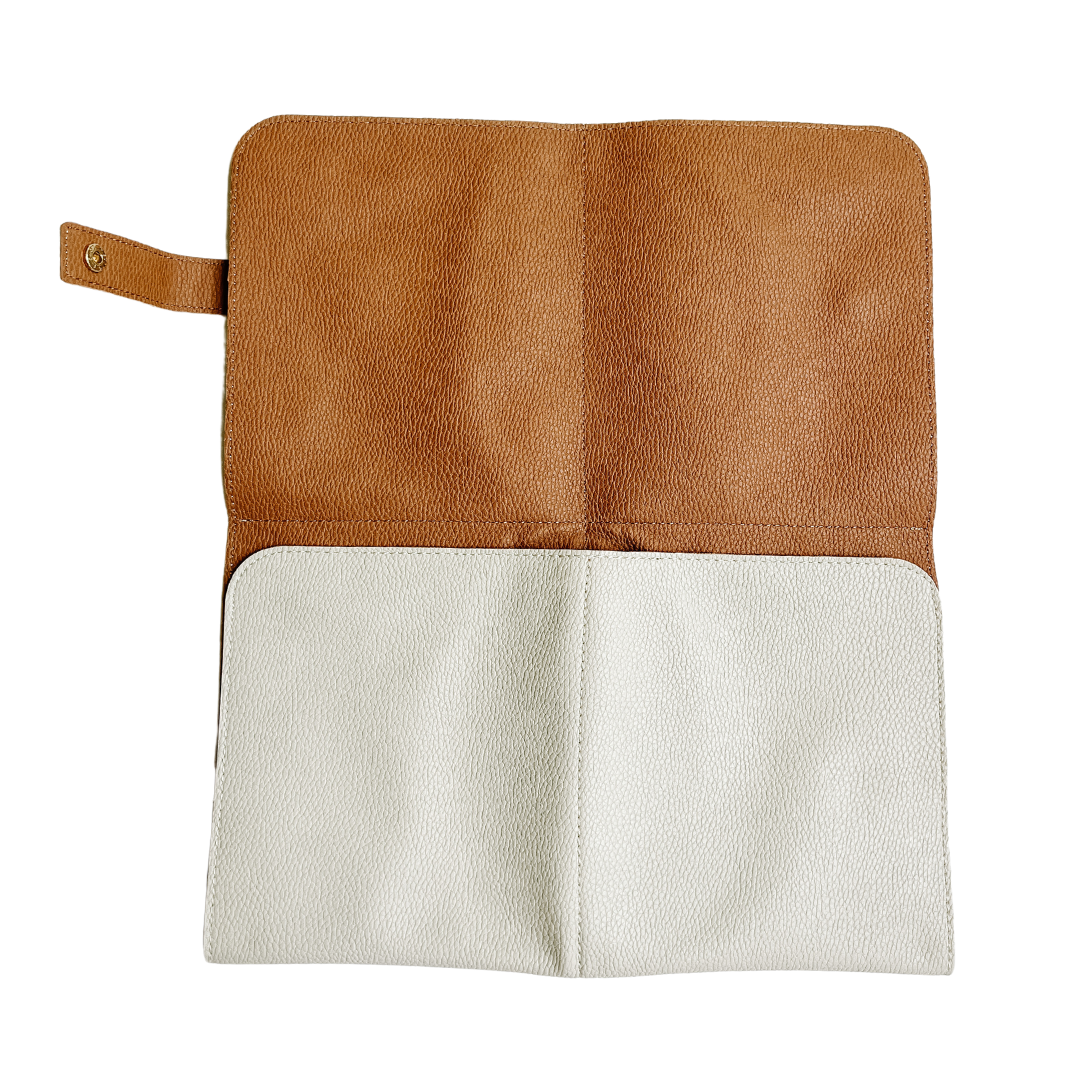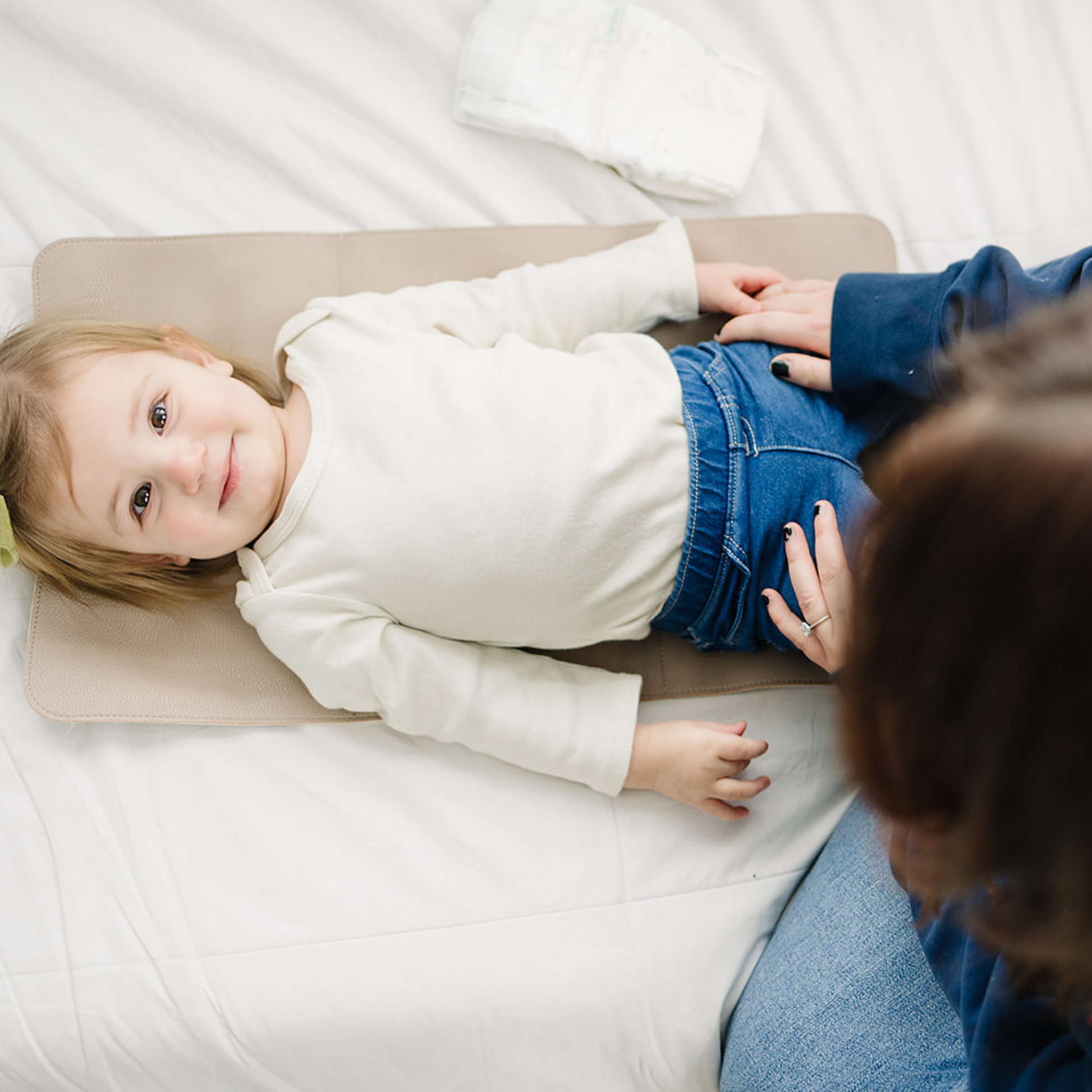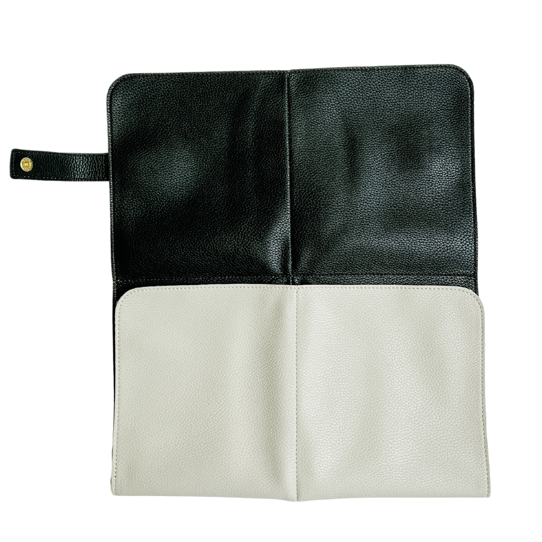 Easily adapt this vegan leather changing mat to fit your needs—use it at home, on the go, or while traveling. It's perfect for diaper changes wherever you are, providing a clean and comfortable surface for your baby. Timeless and versatile, it can be easily rolled up and carried in your bag, ensuring you're always prepared. With luxurious vegan leather on the outside and a wipeable, easy-to-clean interior, this mat combines style with functionality.