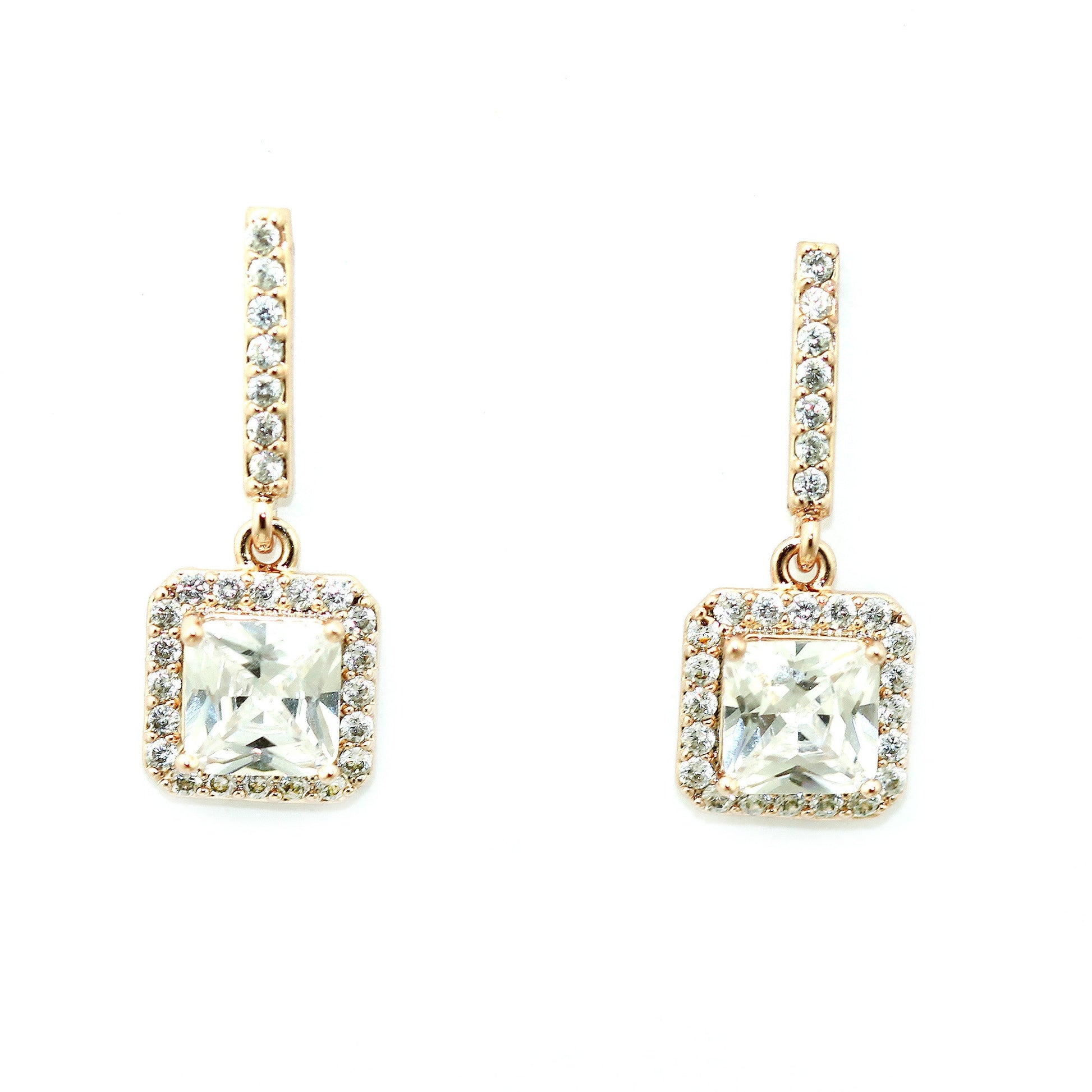 Dress these earrings up or down! They feature sparkling square cut Cubic Zirconia crystals on a dainty bar and drop setting with pave' crystals.