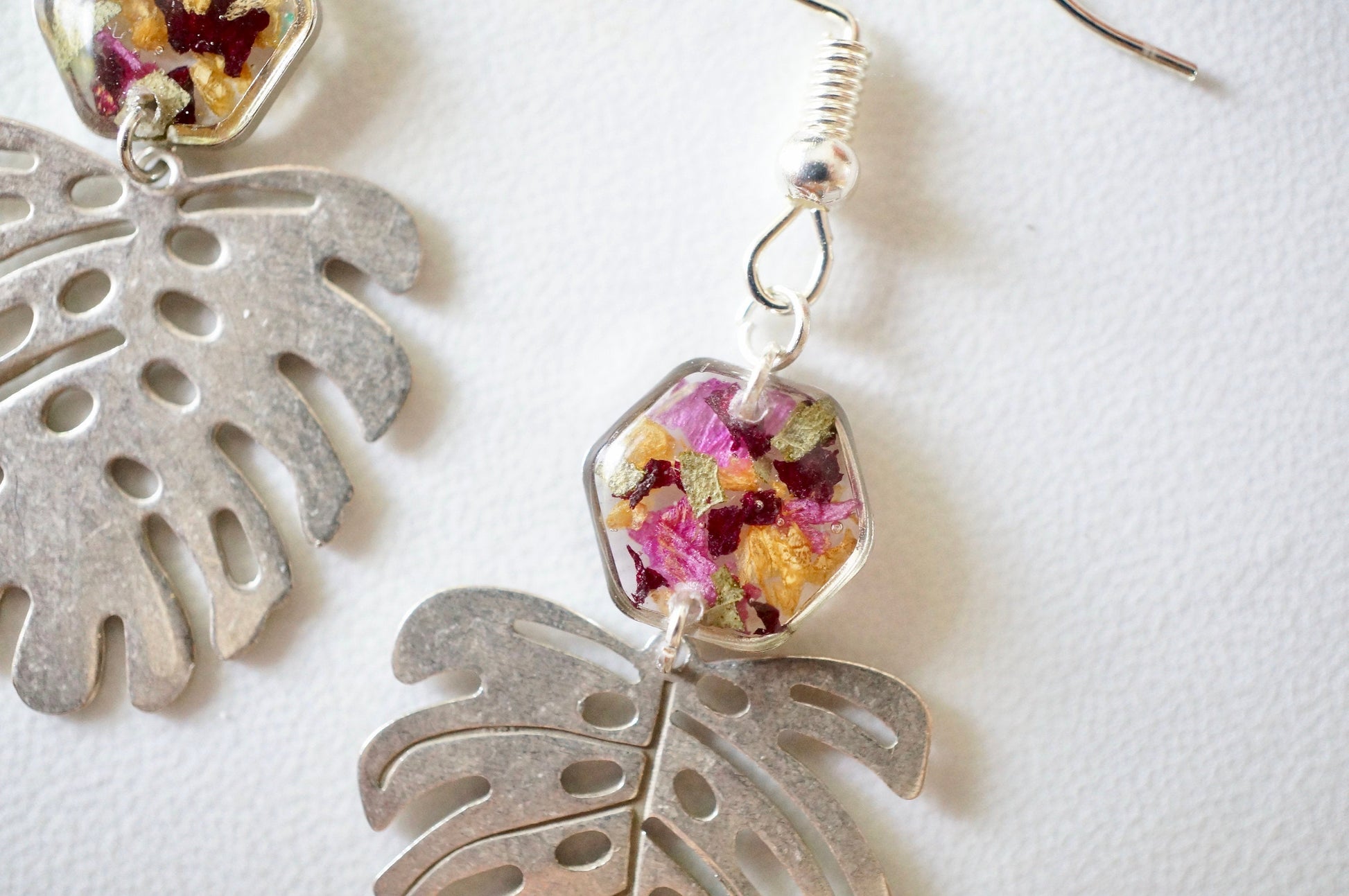 Real Pressed Flowers and Resin Drop Earrings, Silver Palm Leaf and Hexagons in Floral Mix