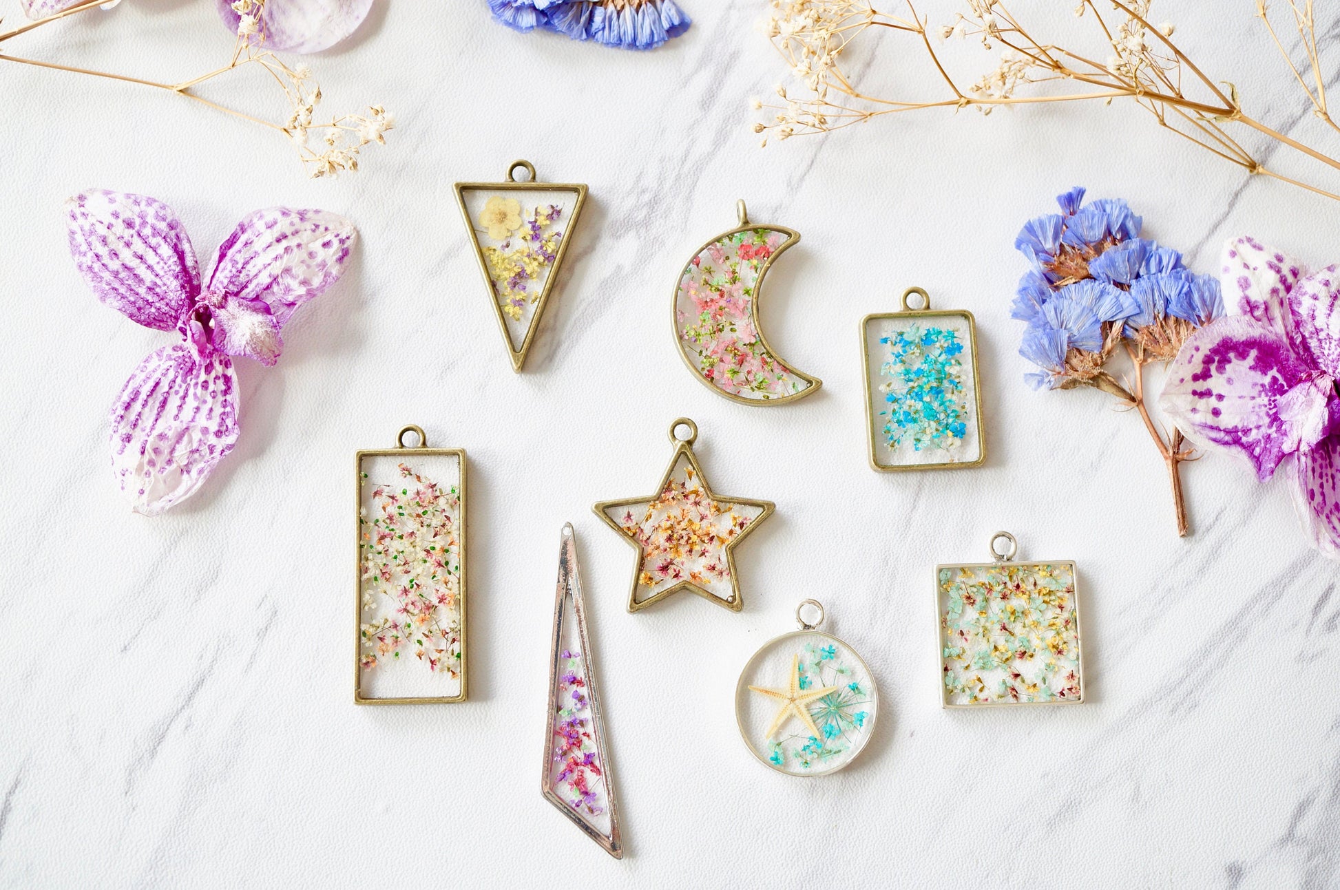 These necklaces are handmade with real pressed flowers encased in resin. Surrounded by a beautiful gold frame, this necklace is like wearing a piece of nature. Each piece is one of a kind. Sometimes we will use the same color combination, but no two are exactly alike!