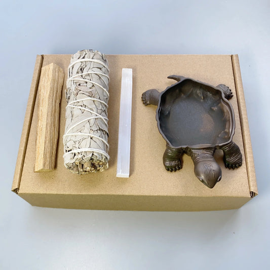 1 set White Sage + Sacred Wood + Selenite Crystal + Tortoise burning tray, Energy Cleansing Ritual Kit, Purification kit